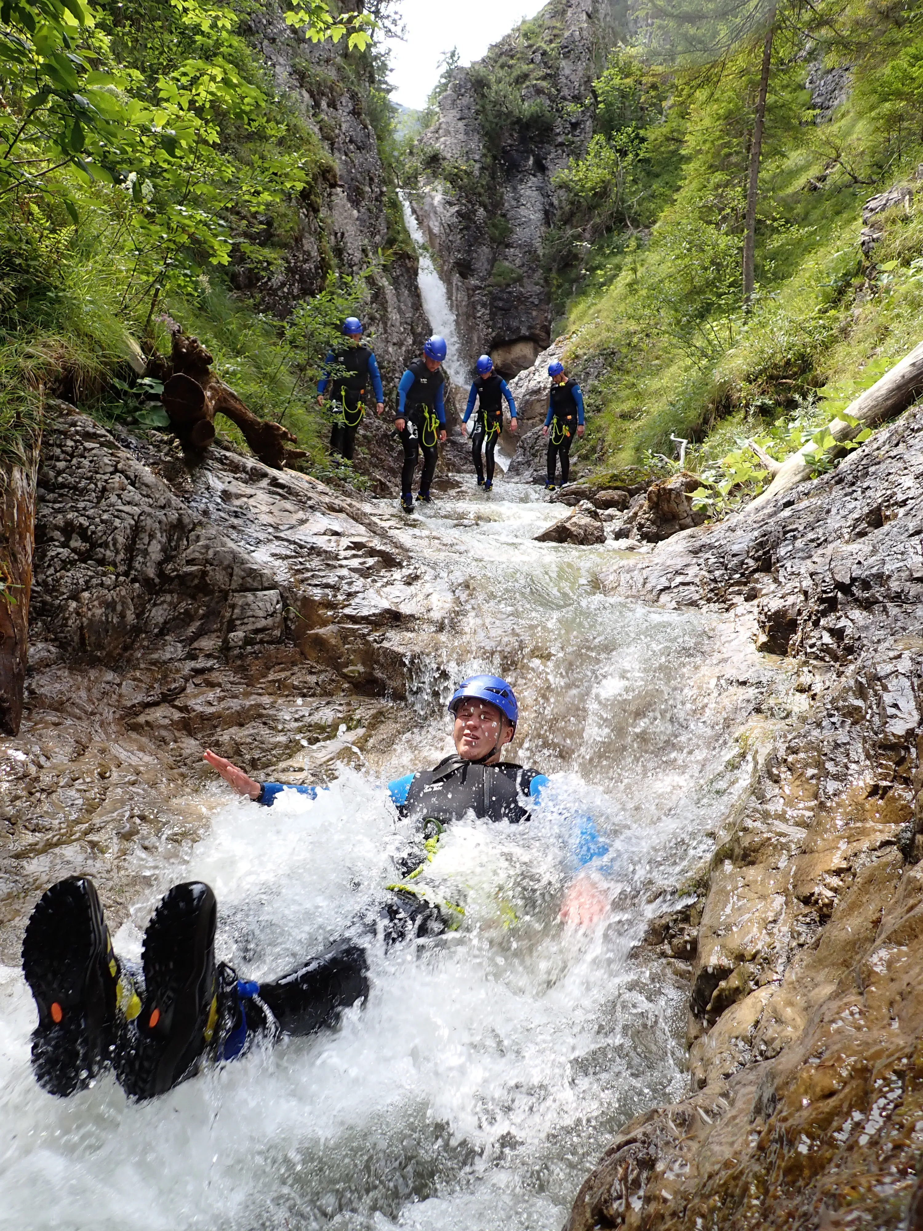 Im Hochalptal befinden sich mehrere Abseilstellen mit max. 25m, ergänzt durch kleine Rutsch- und Kletterpassagen. Ihr werdet sicher von einem unsere Canyoningguides durch die Schlucht geführt.